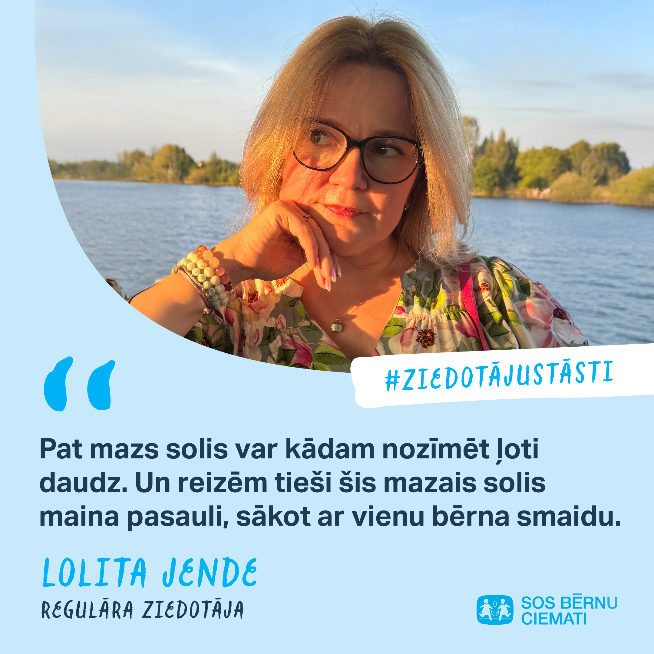 Lolita stāsta, ka viņas pašas dzīvē ir bijis daudz mirkļu, kuros viņa ir sajutusi, cik nozīmīgs ir atbalsts – pat neliels, bet no sirds. “Kad pirmoreiz iepazinos ar SOS Bērnu ciematu darbu, mani aizkustināja, cik daudz mīlestības un rūpju viņi sniedz bērniem, kuri palikuši bez vecāku aizgādības. Es sapratu - ja man ir iespēja kaut mazliet palīdzēt, tad to arī darīšu,” saka Lolita.